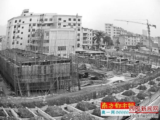 3月末,位于县城安阳镇屏山北路133号的都安县法院,与其仅一圈铁栅栏之隔的20多亩工地上,各种建筑设备开足马力施工,连成一排的幢幢小楼正在砌砖加高。