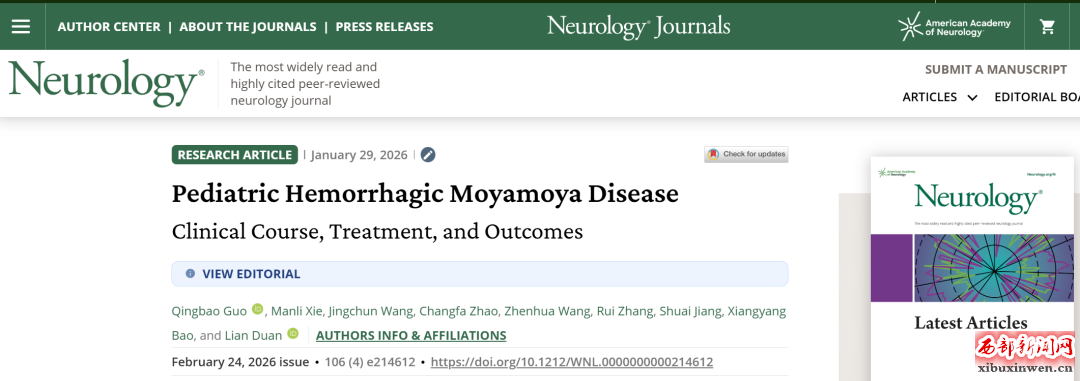 阳光讯(记者 郑亚雷)近日,西安市第九医院神经外科二病区主任郭清保团队的重要研究成果“Pediatric Hemorrhagic Moyamoya Disease:Clinical Course, Treatment, and Outcomes”在国际神经病学顶级期刊《Neurology》(中科院1区/Top期刊,JCR 1区,影响因子9.0)上在线发表。该研究以西安市第九医院为第一完成单位,郭清保主任为第一作者,解放军总医院神经外科学部主任段炼为通讯作者。