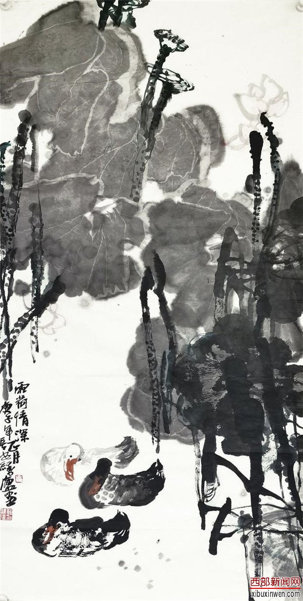 静观郭线庐的水墨花鸟画,在笔意流光中感到牡丹含笑摇曳、雍容大度,透射欣欣荣光;莲蓬于水色天光间相互辉映,充溢郁勃之气。作者的精神意象因造化中的花卉而由此贯通,靠灵动的笔墨而延展。墨彩华章间,撩起观者对历史风华的追思,仿佛遥感烽火相伴的兴庆园内,牡丹竞相绽放的浓艳铺张;内廷倾扎的大明宫里,菡萏漫浮碧池的风动尘香。
