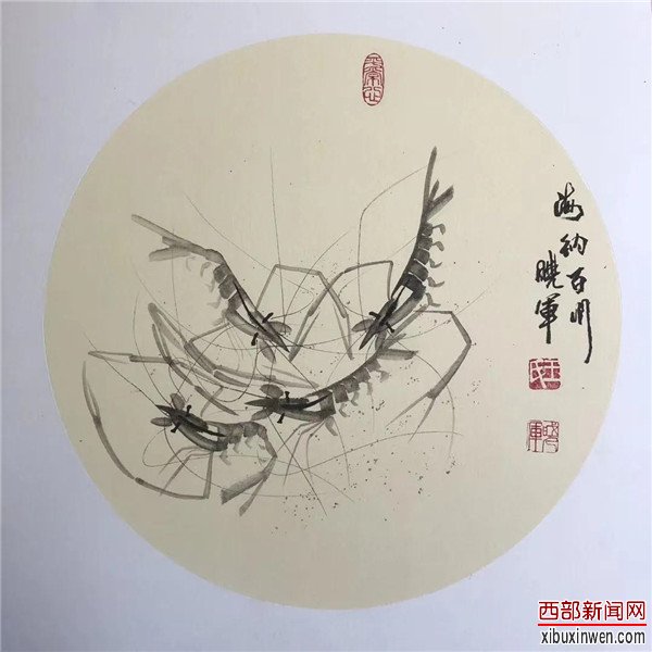 用淡墨掷笔,绘成躯体,浸润之色,更显虾体晶莹剔透之感。以浓墨竖点为睛,横写为脑,落墨成金,笔笔传神。细笔写须、爪、大螯,刚柔并济、凝练传神,尤其是他左手画的虾,灵动活泼、神韵充盈,可见画家王晓军高妙的书画功力。