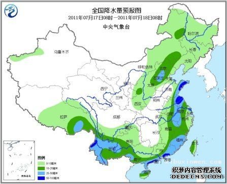 17日08时至18日08时,青海南部、西藏大部、西北地区东部、内蒙古中东部、东北地区、华北、黄淮东部、江淮、江南中东部、华南、云南、贵州中西部等地有小到中雨或雷阵雨,其中,北京南部、河北中部、山东半岛东部、江苏、安徽东南部、江西东北部、福建中南部、华南东部和南部、云南、西藏东南部等地有大雨,局地有暴雨;上述部分地区并伴有短时雷雨大风等强对流天气。东海东部海域将有6~8级东北风。