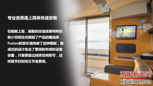 在船艇上面,船艇的改造或者特殊的狭小空间往往限制了产品的额选择,Fusion的音乐墙突破了这种限制,集成式的设计免去了繁琐的布线和设备安置,只需要留出线束空间即可,这样既节约时间又节省费用。