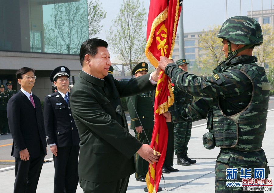 2014年4月9日,中共中央总书记、国家主席、中央军委主席习近平视察中国人民武装警察部队特种警察学院并为“猎鹰突2014年4月9日,中共中央总书记、国家主席、中央军委主席习近平视察中国人民武装警察部队特种警察学院并为击队”授旗。这是习近平将队旗郑重授予“猎鹰突击队”大队长。新华社记者 李刚 摄