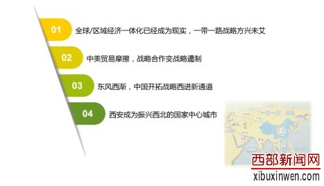 第一,西安具有区位优势。西安是中国海上、陆上丝绸之路的交汇点,是连通东南沿海与亚欧大陆桥的交通枢纽;西安作为西北枢纽中心,也是中国承东启西、联接南北的门户,是中国未来西进的桥头堡。