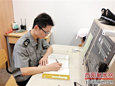 黑框眼镜、皮肤白净、身材削瘦,若不是一身保安服,跟其他学生没什么两样。昨天下午,人民大学“品园五舍”宿舍楼的保安室内,张团政伏在工作台上。在工作间隙,他都会捧起书本复习,备战9月份的司法考试。