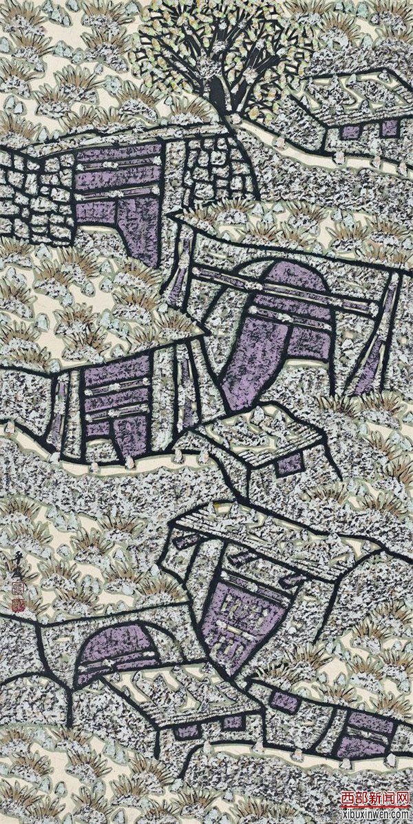 他是当代长安画派中的一员大将,也是一位代表性人物。这个位置是他用相当的艺术功力和强烈的个性面貌赢来的。他—反长安画派传统中以墨为主的技法,落墨极重,落彩极重,形成彩墨并茂的视觉效果。他以短促有力的墨线和紧劲密匝的彩线相渗相接的手法,如织锦瑟般地画出了硬朗、坚实的物象质地,也画出了浓郁热烈的生命活力。曾经以苦涩、荒凉、贫瘠为特点的西北山水意境在他的笔下换成了温醇、绚丽、辉煌的山水华章。厚实的黄土高原及生态环境落入他的视野,便生成了陕西水墨艺术充实、具体的西北风仪。
