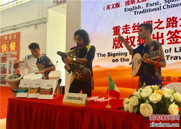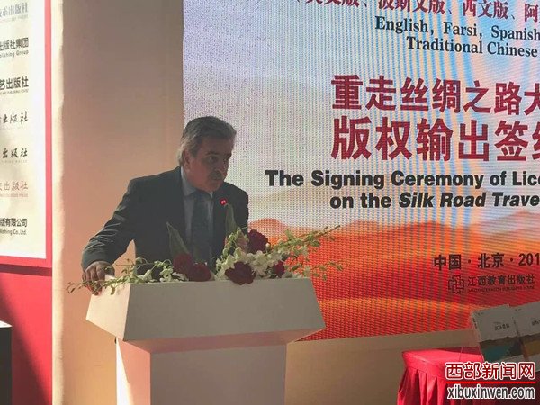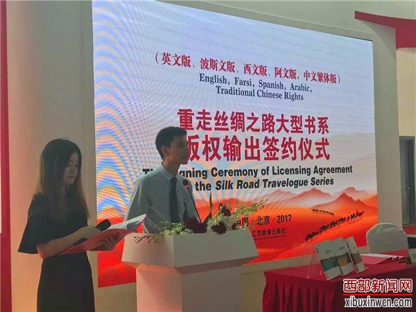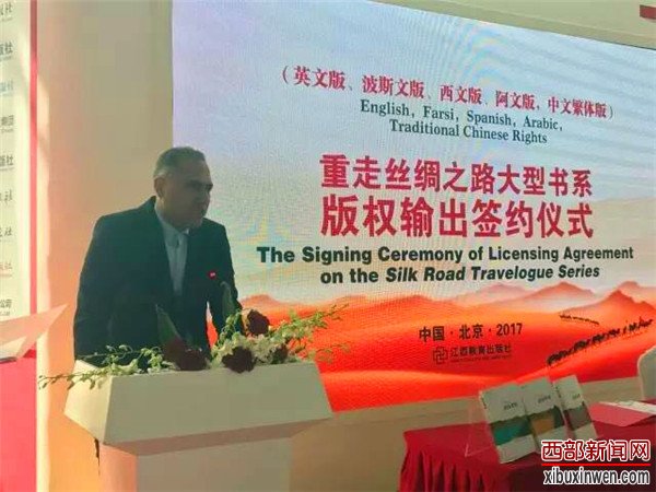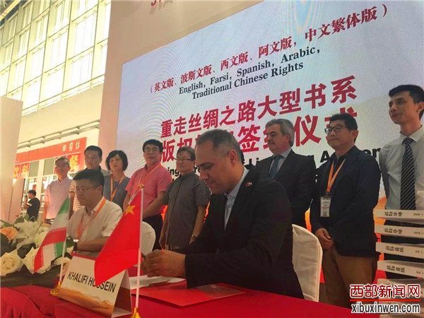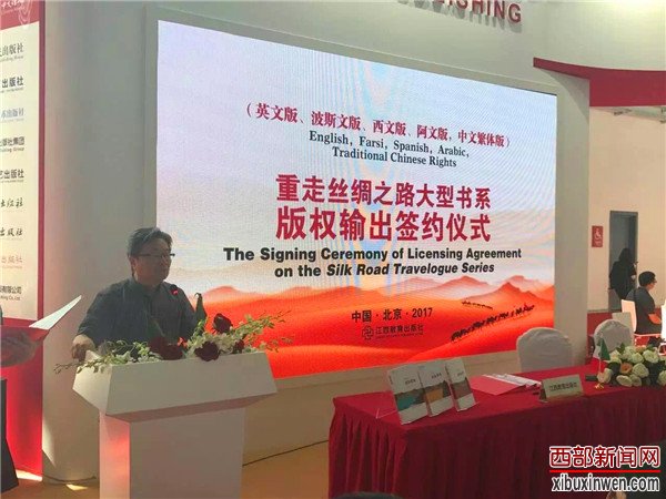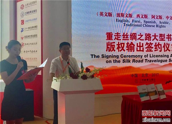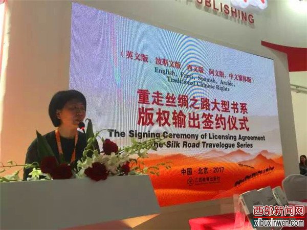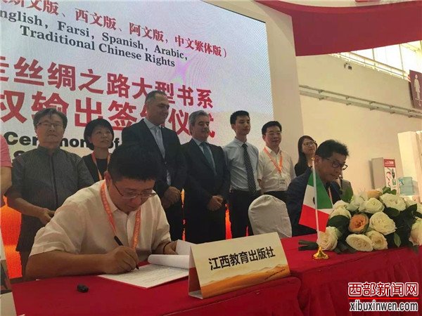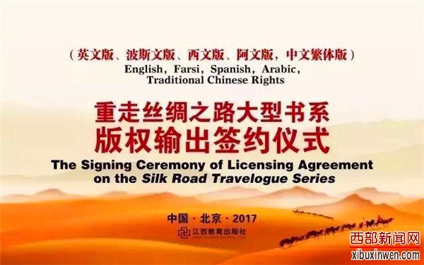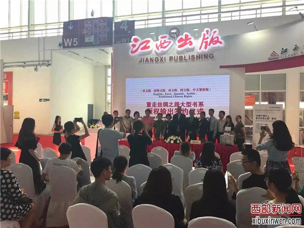 西部新闻网讯 (记者张龙 ) 8月23日下午,在第二十四届北京国际图书博览会上,举行了江西教育出版社“重走丝绸之路大型书系”版权输出签约仪式。这套“丝路万里行”首批推出的《丝路云谭》《丝路商旅》《丝路华语》三本书,全由陕西省作者肖云儒、徐君峰、李刚创作,在这次国际书博会上,一次实现了英文、波斯文、西班牙文、阿拉伯文以及中文繁体字在内的多语种版权的输出。