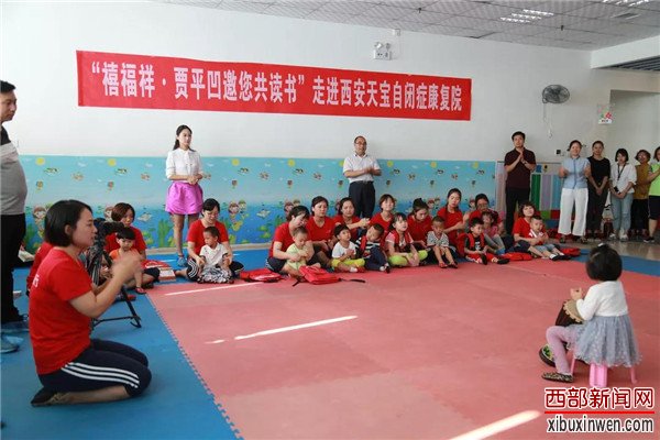 9月7日下午2:30,由贾平凹文化艺术研究院总策划、陕西禧福祥品牌运营有限公司总冠名、西安市委宣传部指导、中国散文学会、陕西省作家协会、陕西省新闻出版广电局、曲江管委会联合主办的“禧福祥·贾平凹邀您共读书”全民阅读公益活动第86期,在西安天宝自闭症康复院举行。贾平凹文化艺术研究院执行院长、“禧福祥·贾平凹邀您共读书”总策划王立志,陕西禧福祥品牌运营有限公司代表,贾平凹文化艺术研究院“读书使者”、陕西广播电视台故事广播主播刘禹彤,著名摄影家、作家田建国,陕西省书法家协会会员李锐,陕西省周易研究会副秘书长张雨舒,公益志愿者宋成贵,西安天宝自闭症康复院的院长谢延红以及院里30位老师和15个孩子共同参加了本次公益活动。贾平凹文化艺术研究院以及陕西禧福祥品牌运营有限公司向本次活动捐赠了《贾平凹文集》、陈希学作品集、红书包、T恤衫、帽子、米、面、油、月饼等价值总计近万元的物品。