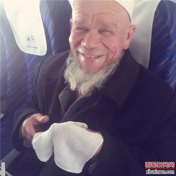“当时我问了你的名字你告诉我你叫帕提古丽,你还给了我三条小毛巾呢,我用了两条,还有一条没有舍得用就带在身上,我一直记得你呢。”说到这里,老人颤抖小心地从衣服内侧的口袋里拿出了一条十年前帕提古丽在航班上给他擦汗擦手用的小毛巾。老人拿着毛巾,笑地像个孩子一样看着她。