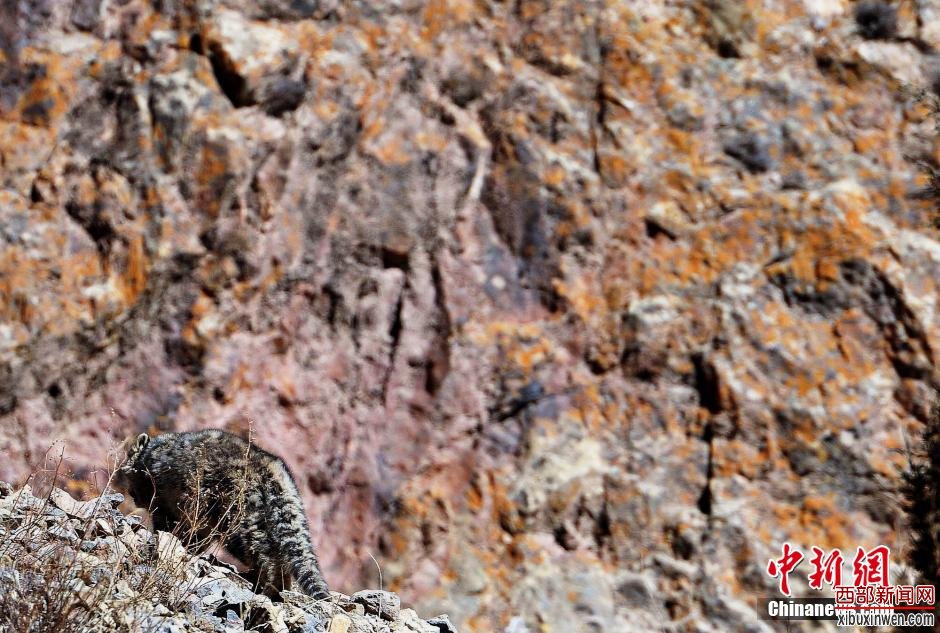 经过一年多的苦苦寻找,青海玉树摄影爱好者噶松仁青分别于2013年11月中旬、12月15日、12月16日,在玉树州杂多县结扎乡沙青沟成功拍摄到了三组雪豹照片。图为一只幼年雪豹。