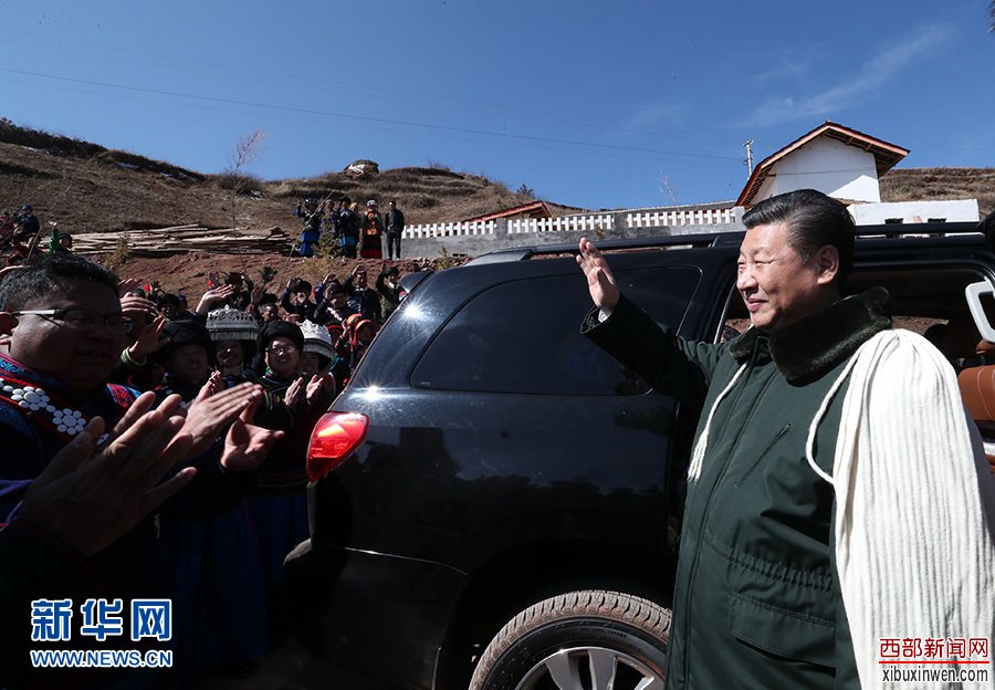 2月11日,中共中央总书记、国家主席、中央军委主席习近平在四川考察。这是习近平在凉山彝族自治州昭觉县解放乡火普村同乡亲们道别。新华社记者 谢环驰 摄