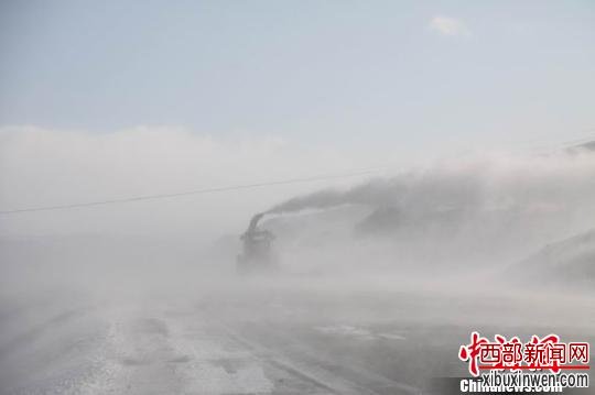 7日,世界著名风区新疆省道201线玛依塔斯路段再遭大风袭击,由于风吹雪并形成雪阻,地面能见度极低,63辆车和车上147人被困。图为风力转小后玛依塔斯防风雪基地除雪车除雪。