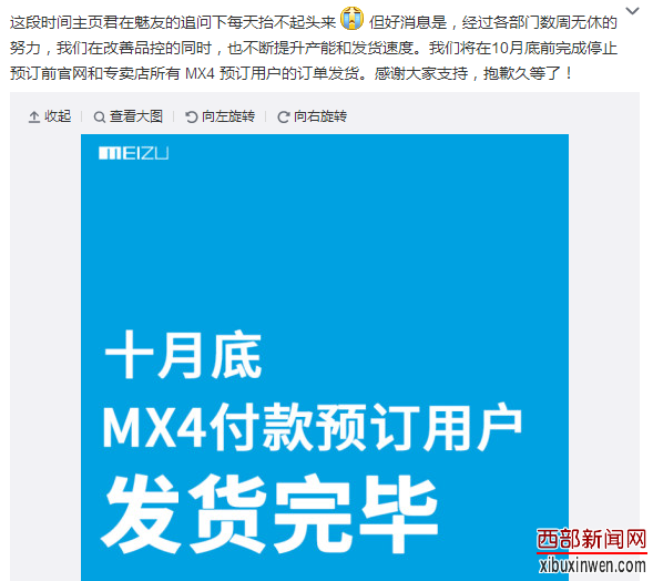 根据魅族在微博上发布的公告显示,“我们将在10月底前完成停止预订前官网和专卖店所有 MX4 预订用户的订单发货。”而下面微博配图中的文字内容则说“十月底MX4付款预订用户发货完毕”。